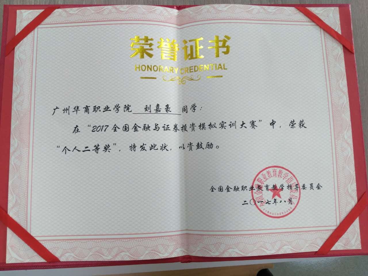 由全国金融职业教育教学委员会主办、深圳国泰安教育技术有限责任公司承办的“2017全国金融与证券投资模拟实训大赛”初赛赛程已经结束,此次竞赛共有来自全国220所院校,846支队伍参与,参赛人员达到了8460人。经过近2个月的激烈角逐,由侯娟老师指导的刘嘉豪、李晓雯两名同学,以全国排名第199位、第740位的成绩分别荣获得个人二等奖和个人三等奖,侯娟老师荣获优秀指导老师称号,为学院争得了荣誉。